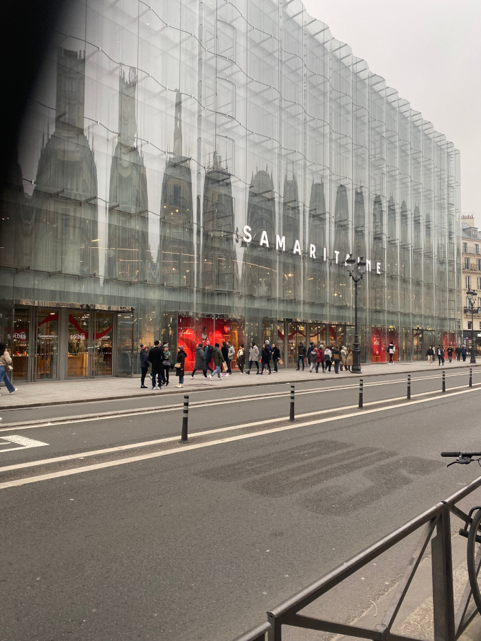 サマリテーヌ(Samaritaine)。パリの代表的な百貨店の一つで、その歴史は19世紀に遡ります。ルーヴル美術館の近くにあり、内装は、新古典主義とアール・ヌーヴォーの要素を組み合わせた独特のデザインです。写真は、2021年6月にリニューアルオープンを迎えました。全面改装したリヴォリ館のファサードで、波打った透明ガラスで覆われています。設計を行ったのは、妹島和世+西沢立衛/SANAAです。